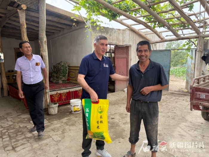 6月4日,阿克苏地区融媒体中心驻沙雅县红旗镇先进村工作队和村“两委”给困难家庭送上生活必需品。董成忠 摄