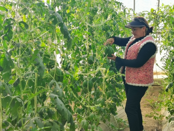 11月5日,阳光透过尤库日喀拉尤勒滚村现代设施农业果蔬生产基地的温室大棚,洒落在翠绿的藤蔓上,一个个饱满的西瓜、纺锤形的羊角蜜、圆润的蜜瓜悬挂在藤蔓架上,果香扑面。布阿西古丽•塔依尔和姐妹们穿梭在藤蔓间,仔细挑选着成熟度最佳的西瓜,采摘、装盒动作娴熟。这些采摘下来的西瓜一部分将直达市场销售,另一部分将送往金湖杨国家5A级旅游景区,让游客第一时间品尝到“甘甜的礼物”。