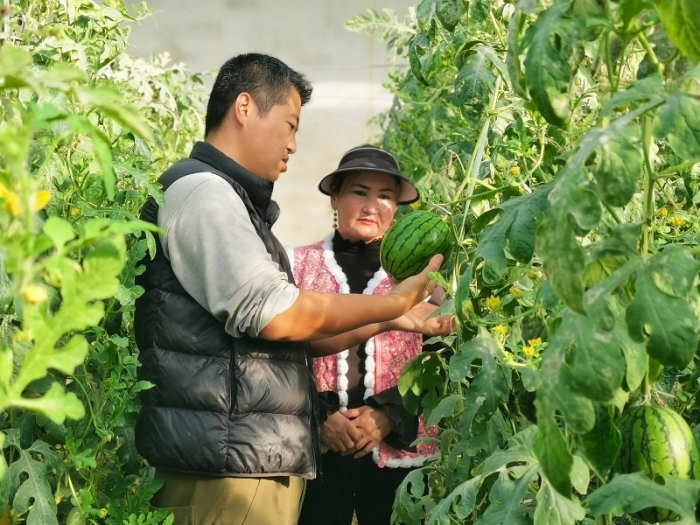 技术员和农户查看礼品小西瓜成熟情况。