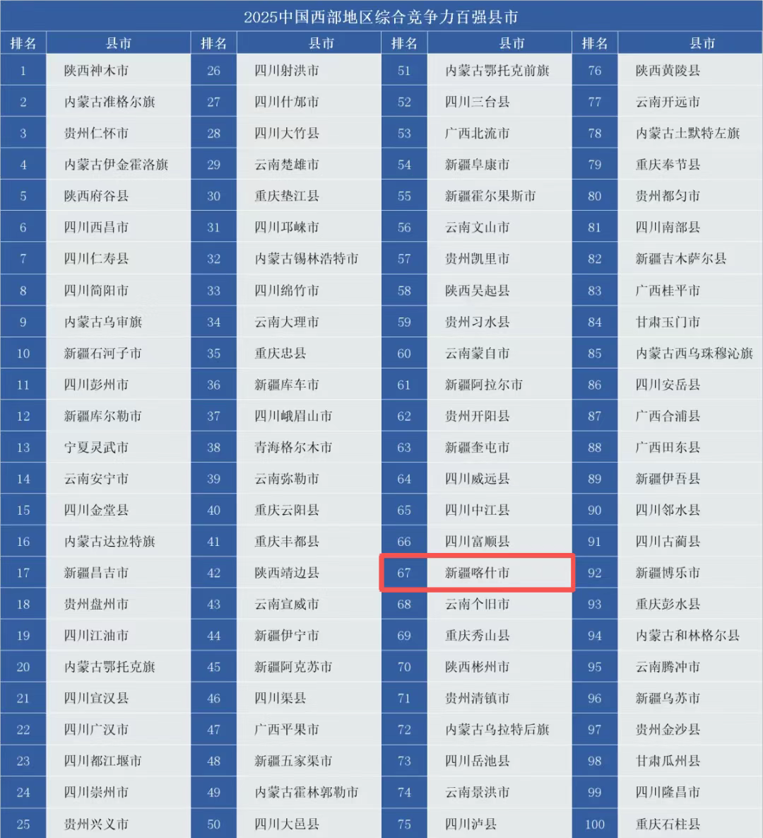 名单显示,石河子市(10)、库尔勒市(12)、昌吉市(17)、库车市(36)、伊宁市(44)、阿克苏市(45)、五家渠市(48)、阜康市(54)、霍尔果斯市(55)、阿拉尔市(61)、奎屯市(63)、喀什市(67)、吉木萨尔县(82)、伊吾县(89)、博乐市(92)、乌苏市(96)入选2025中国西部百强县市;乌鲁木齐新市区(13)、乌鲁木齐头屯河区(39)、克拉玛依市克拉玛依区(40)、乌鲁木齐市天山区(41)、哈密市伊州区(42)、乌鲁木齐市米东区(46)、乌鲁木齐市沙依巴克区(49)、乌鲁木齐市水磨沟区(53)入选2025中国西部百强区(括号内均为百强排名)。