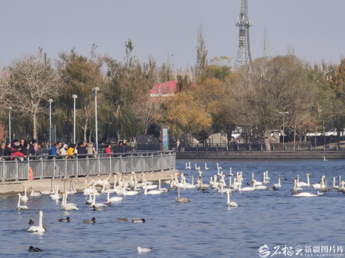 近日,库尔勒市杜鹃河畔数百只天鹅引来市民驻足观赏。黄万里摄