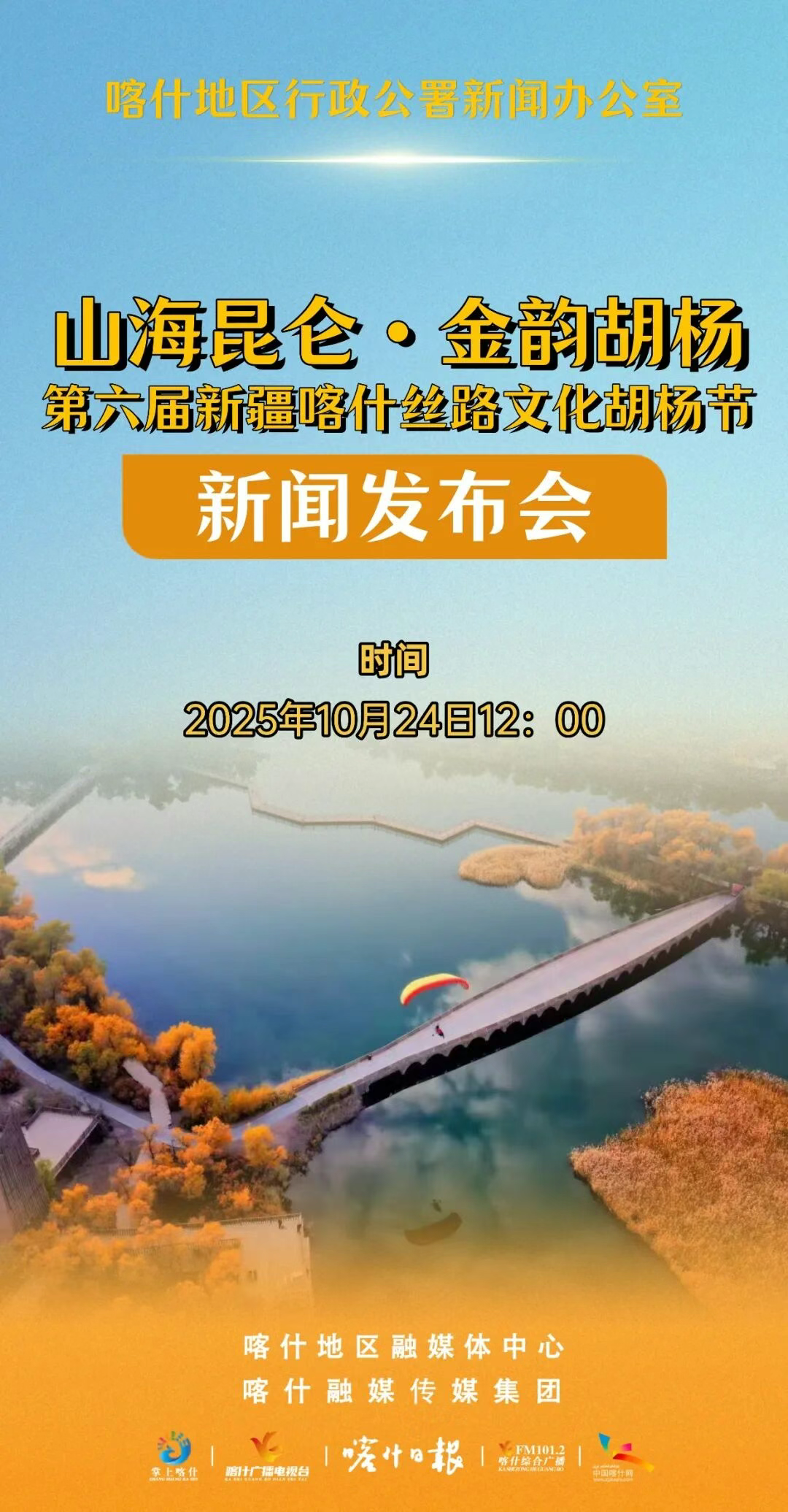 “山海昆仑·金韵胡杨”第六届新疆喀什丝路文化胡杨节新闻发布会将于2025年10月24日12:00召开届时喀什地区融媒体中心新媒体平台“喀什零距离”视频号、“掌上喀什” 客户端“喀什广播电视台”抖音账号等将进行全程直播扫描下方二维码观看敬!请!关!注